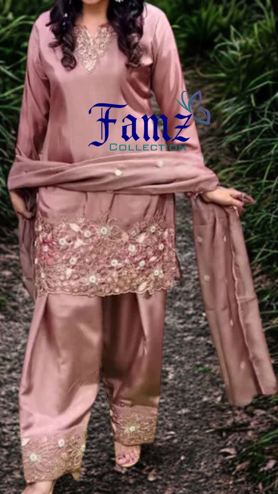 Fabric : Pure Crepe Color : Brown Set Includes : Kurti, Trouser and Dupatta